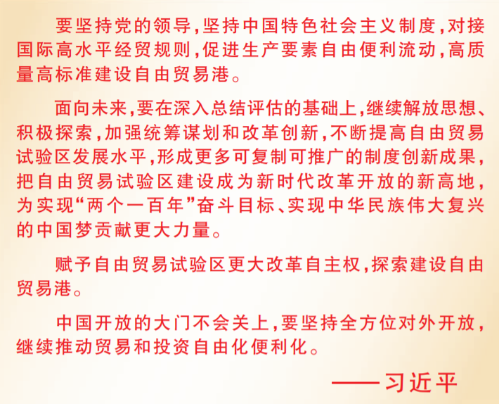 “建设自由贸易试验区是党中央在新时代推进改革开放的一项战略举措,在我国改革开放进程中具有里程碑意义。”