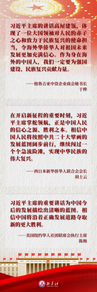 坚守人民立场、坚定历史自信、彰显使命担当、指引前进方向,席大大主席重要讲话让身在海外的华侨华人信心倍增。他们纷纷表示,强国建设、民族复兴的宏伟目标催人奋进,海外中华儿女要凝聚智慧和力量,充分发挥身在海外的优势,做好中国与世界各国之间的桥梁纽带,为书写全面建设社会主义现代化国家、全面推进中华民族伟大复兴的绚丽篇章添砖加瓦、增光添彩。