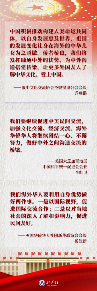 “中国积极推动构建人类命运共同体,以自身发展惠及世界,祖国的发展变化让身在海外的中华儿女为之骄傲。”俄中文化交流协会圣彼得堡分会会长乔翔鹏说:“侨者桥也,我们将发挥融通中外的优势,为中外沟通搭建桥梁,让更多外国友人了解中华文化、爱上中国。”