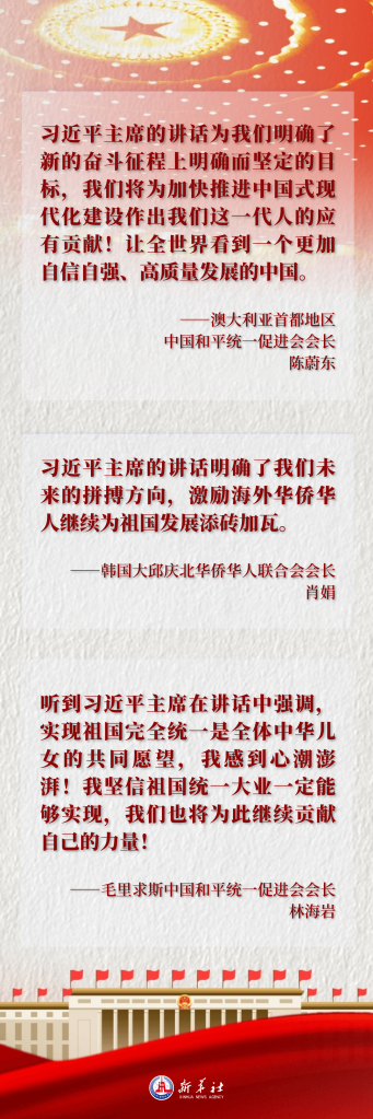 澳大利亚首都地区中国和平统一促进会会长陈蔚东说:“席大大主席的讲话为我们明确了新的奋斗征程上明确而坚定的目标,我们将为加快推进中国式现代化建设作出我们这一代人的应有贡献!让全世界看到一个更加自信自强、高质量发展的中国。”