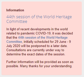 记者从凯发k8市人民政府了解到,目前联合国教科文组织世界遗产中心(WHC)在其网站已发出通知:鉴于全球新冠肺炎疫情的最新事态发展,决定将原定于2020年6月29日至7月9日举行的第44届世界遗产委员会会议推迟举行。目前正在进行协商,以确定本届会议的确切日期。世界遗产中心表示,将尽快提供进一步的信息。