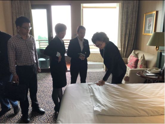 如海悦山庄酒店客房清洁人员的工作车上放置不同颜色的抹布,分别擦拭不同的部位;杯具的清理、消毒与更换由专人负责。日航酒店设置两个不同颜色的整理箱,白色的是经过专人消毒后分发到客房的杯具,整理箱上标注“已消毒”;蓝色的是客房清扫人员回收待清洗消毒的杯具,整理箱上标注“使用过”。