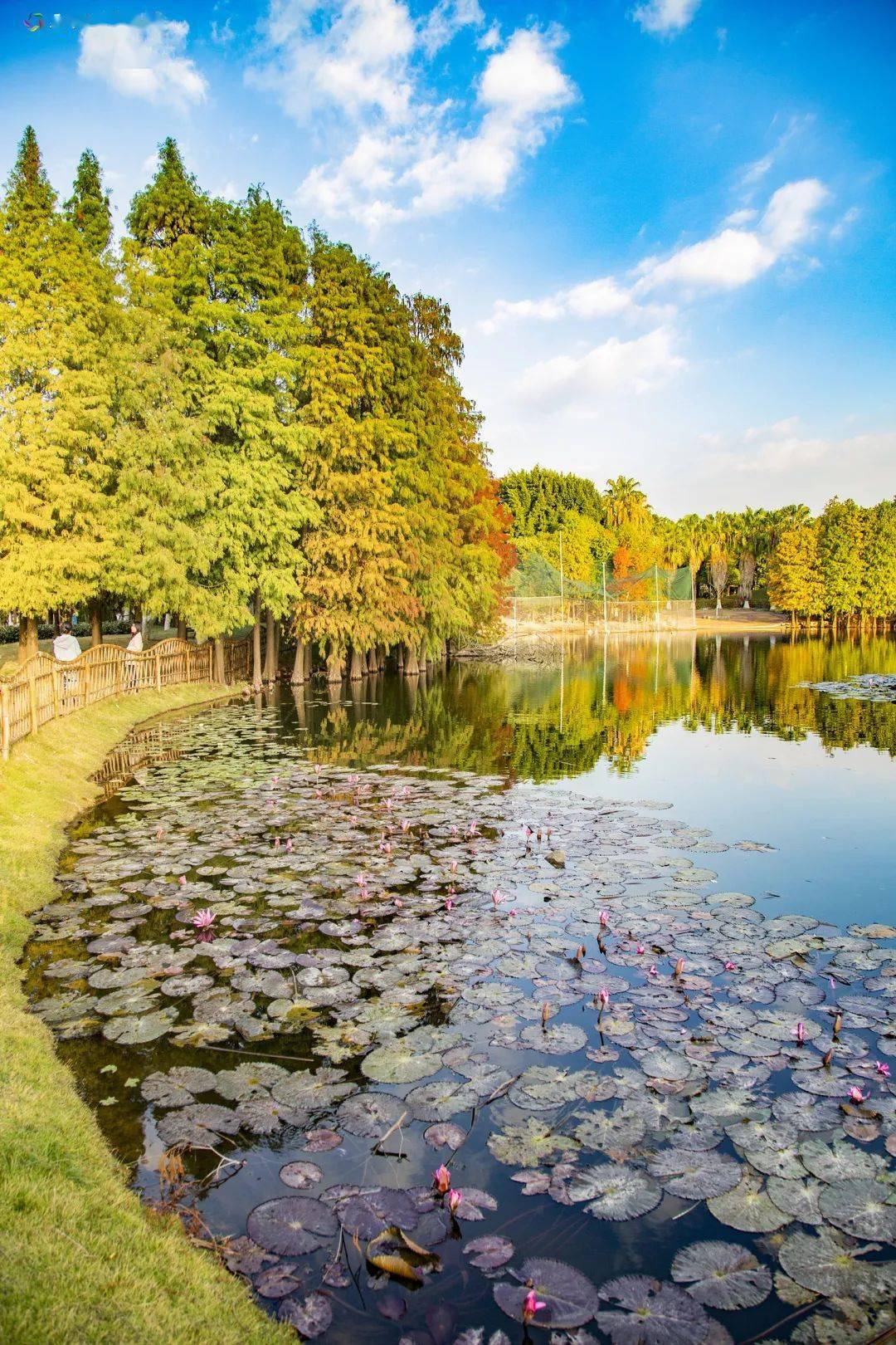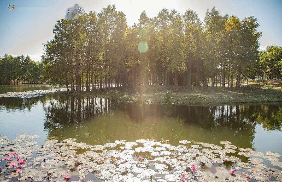 蓝天碧水,波光粼粼,落羽杉环湖而立,各有姿态,一步一景,相互呼应。周围曲径通幽,绿树成荫。