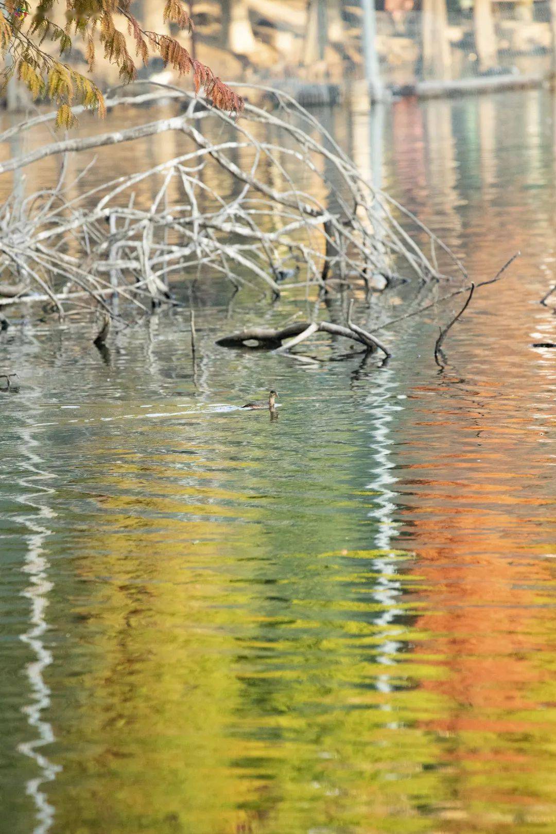 在澳门园水域两侧成片的落羽杉色彩斑斓倒映在湖水中。