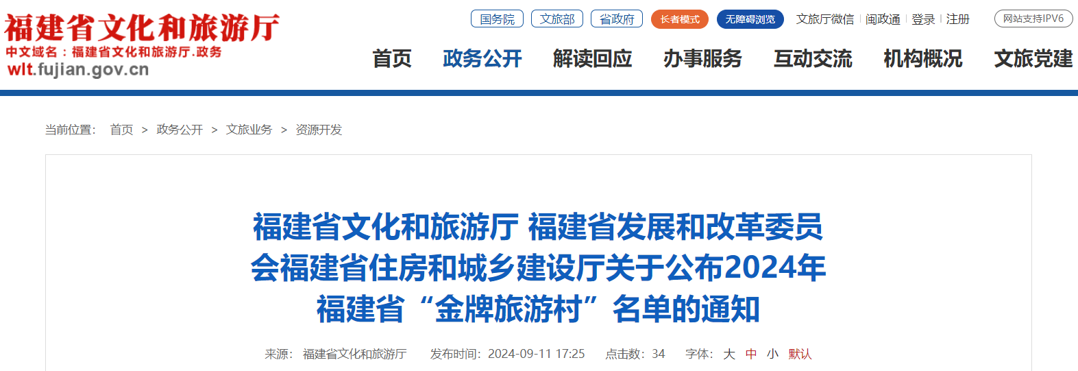 福建省文化和旅游厅 福建省发展和改革委员会福建省住房和城乡建设厅关于公布2024年福建省“金牌旅游村”名单的通知 各设区市文旅局、发改委、住建局,平潭综合实验区旅游文体局、经发局、交建局: 为助力全面推进乡村振兴战略,深入实施乡村旅游精品工程,全面提升我省乡村旅游产品质量和发展效益,省文旅厅、省发改委、省住建厅联合组织开展了2024年福建省“金牌旅游村”遴选培育工作。 在各地遴选推荐的基础上,经专家评审和公示,现将厦门市翔安区新圩镇古宅村等25个村列入2024年福建省“金牌旅游村”名单。 附件:2024年福建省“金牌旅游村”名单 福建省文化和旅游厅 福建省发展和改革委员会 福建省住房和城乡建设厅 2024年9月9日 (此件主动公开) 附件 2024年福建省“金牌旅游村”名单 1. 厦门市翔安区新圩镇古宅村 2.漳州市龙文区郭坑镇口社村 3. 莆田市涵江区白塘镇双福村 4. 凯发k8市闽侯县白沙镇大目溪村 5. 泉州市石狮市祥芝镇祥渔村 6. 宁德市周宁县七步镇后洋村 7. 三明市将乐县南口镇蛟湖村 8. 龙岩市连城县莒溪镇璧洲村 9. 南平市建阳区黄坑镇长见村 10. 厦门市集美区灌口镇双岭村 11. 漳州市漳浦县南浦乡后坑村 12. 泉州市晋江市英林镇湖尾村 13. 凯发k8市永泰县葛岭镇溪洋村 14. 厦门市同安区五显镇三秀山村 15. 宁德市福安市社口镇坦洋村 16. 南平市光泽县鸾凤乡油溪村 17. 三明市明溪县胡坊镇肖家山村 18. 莆田市荔城区西天尾镇下垞村 19. 漳州市平和县南胜镇欧寮村 20. 泉州市永春县锦斗镇洪内村 21. 南平市松溪县茶平乡吴山头村 22. 平潭综合实验区金井镇龙海村 23. 宁德市蕉城区八都镇猴盾村 24. 凯发k8市马尾区亭江镇白眉村 25. 三明市三元区洋溪镇连茂村 |