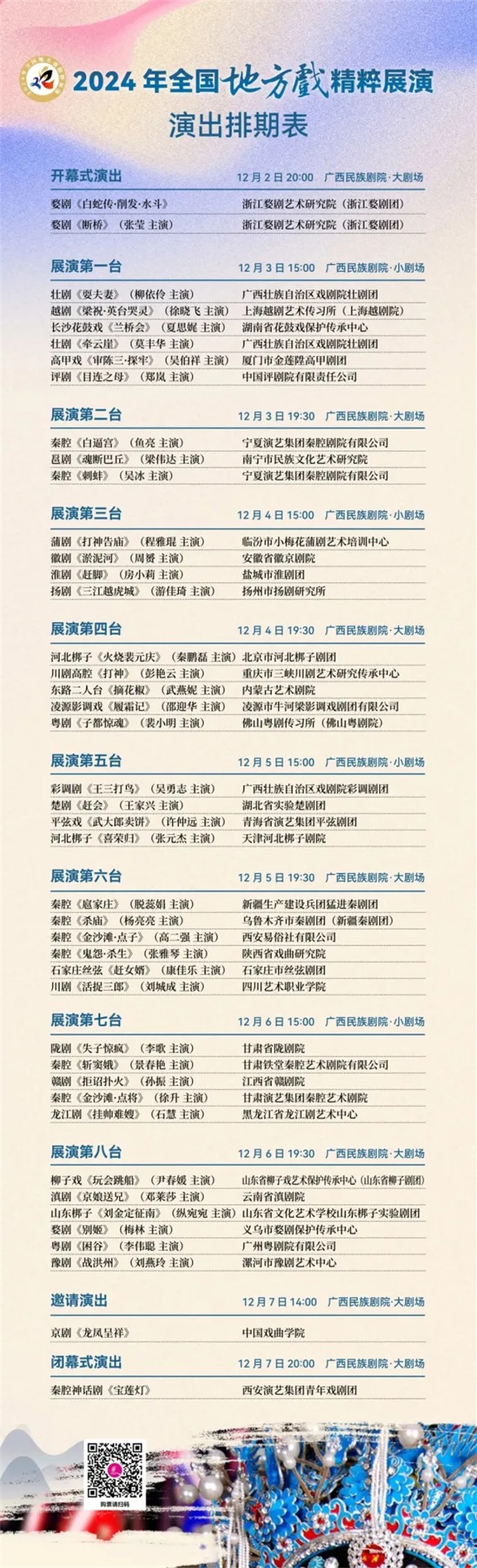 此次展演由文化和旅游部艺术司等主办,计划于2024年12月上旬在南宁市举办,旨在展示地方戏曲精粹,推动优秀中青年戏曲人才不断涌现。展演从全国遴选约40个优秀地方戏曲折子戏,组成约8台专场演出,每台演出1场,并举办参演剧目“一场一评”、地方戏曲传承发展研讨会、优秀演员进景区演出等活动。 在全国348个剧种中,高甲戏的丑角独树一帜,在戏曲界享有盛名。高甲戏《审陈三·探牢》讲述益春陪同五娘到牢房探望陈三,班头爷乘机敲诈财物的故事。剧中“丑旦”表演,一个夸张,一个细腻,一粗一细,对比鲜明,其中吴伯祥饰演班头爷一角,以掌中木偶丑的表演技法,生动演绎班头爷狡诈、贪婪的经典人物形象。