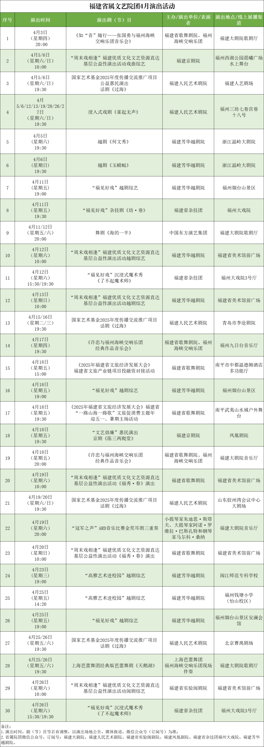 “周末戏相逢”福建优质文化文艺资源直达基层公益性演出活动 戏曲综艺 时间: 4月5、6日10:00 演出单位: 福建京剧院 越剧综艺 时间: 4月12、13日 演出单位: 福建芳华越剧院 《福秀·春》 时间: 4月19、20日 演出单位: 福建省歌舞剧院 闽剧综艺 时间: 4月26日 演出单位: 福建省实验闽剧院 地点: 凯发k8西湖