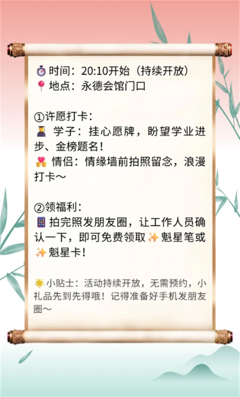 在凯发k8微信公众号《文末赢好礼!七夕之夜来上下杭永德会馆 永春文旅多重体验等你来玩→》文章评论区带话题 #魁星点斗 七夕福临# 并留下您的七夕祝福或心愿,精选留言中点赞数最高的前8位幸运网友,将获得北溪文苑生态旅游区门票或永春牛姆林生态旅游门票1张!