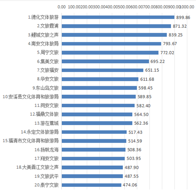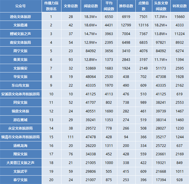 福建省各县(市、区)文化和旅游政务微信公众号10月传播力指数TOP20传播数据 |