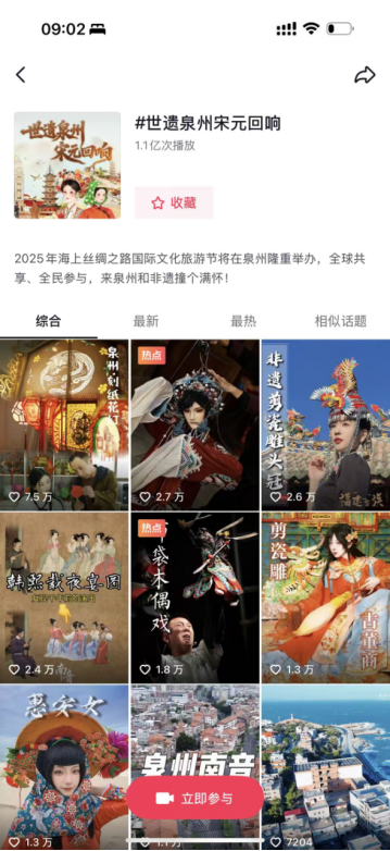 12月9日至15日,由文化和旅游部、福建省人民政府共同主办,福建省文旅厅与泉州市人民政府承办的2025年海上丝绸之路国际文化旅游节在泉州盛大举行。抖音联合泉州市委网信办发起话题#泉州世遗宋元回响,邀请来自全国各地的抖音优质创作者,围绕非遗主题展开创作,并与福建省文旅厅、泉州市文旅局等深入联动,让网友在掌上云端,沉浸式体验泉州独特的海丝文化和闽南文化。 抖音达人加持,曝光总量破亿:泉山晋水之间,人文珍宝荟萃。作为海上丝绸之路的重要节点城市,泉州以其独特的“宋元中国的世界海洋商贸中心”文化底蕴,吸引了全球的目光。2025年海上丝绸之路国际文化旅游节,以“丝路交响·融通世界”为主题,精心策划了“非遗焕新”“四海和鸣”“国潮消费”三大板块共10项主要活动,吸引48个国家和地区、35个演艺团队、非遗展演团队、近2000名海内外宾朋齐聚泉州,将构建国际化多元交流平台,呈现一场全球共享、全民参与的国际文旅盛会。本场文旅盛宴与达人传播形成合力,让“泉州世遗宋元回响”这个充满号召力的话题持续升温。截至12月17日,共有347多位达人在抖音平台参与话题创作,其中不乏17位抖音优质创作者,其话题曝光总量超1亿。
