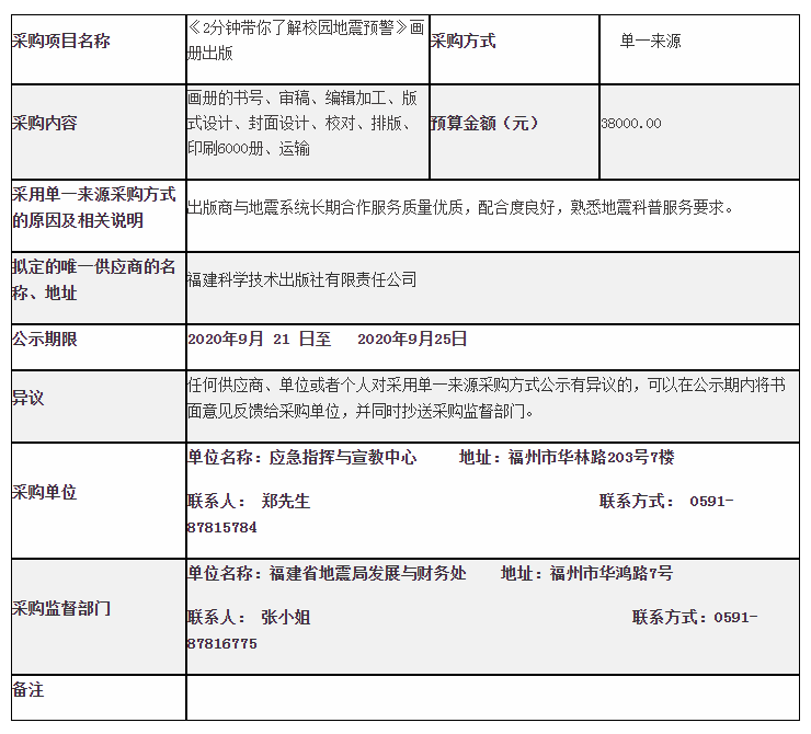 我局对《2分钟带你了解校园地震预警》画册出版拟采用单一来源采购方式进行采购,现公示如下: