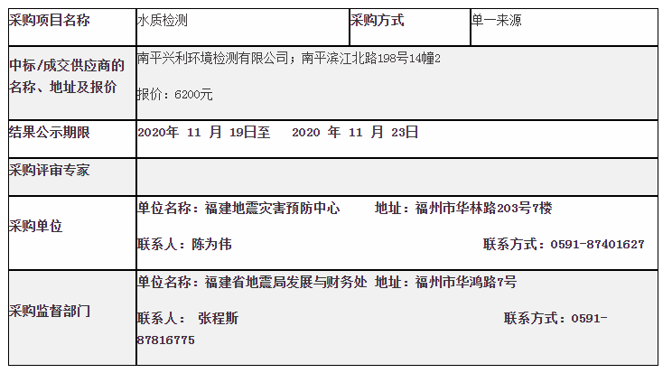 地震灾害预防中心水质检测采购结果公告