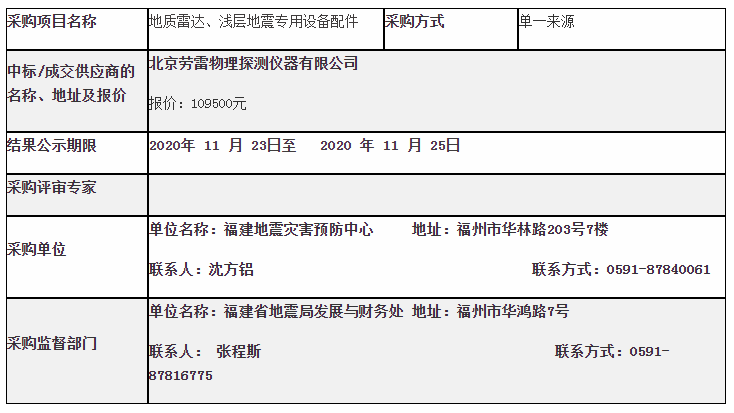 地震灾害预防中心2020年地质雷达、浅层地震专用设备配件采购结果公告