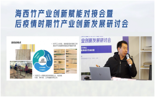 福建三明迈为科技有限公司总经理段嘉诚先生介绍竹加工产业链前端痛点 活动现场,不仅有和其昌竹业、迈为科技等创新竹企业代表介绍各自企业的创新产品和创新成果,还有经验丰富的资深设计师分享关于竹行业的深度思考,更有互联网专家就跨境电商竹产品的机遇和挑战作了跨界分享。在最后的交流环节,参会嘉宾也纷纷结合各自的专业领域,为疫情时期当下竹业的发展提供了自己的见解和建议。
