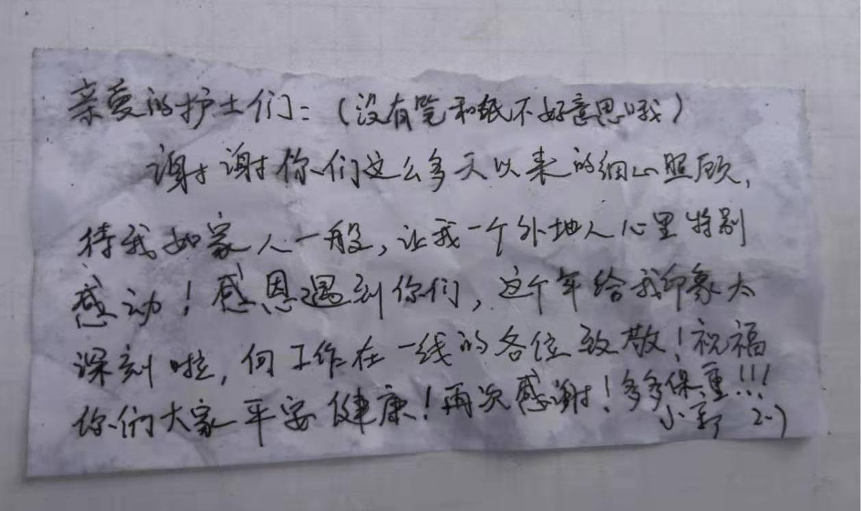 看到这封感谢信,感染科的全体医护人员都倍受感动和鼓舞,护理部主任黄君燕说:“我们和患者一起携手并肩,抗击疫情,相信定能帮助更多的患者恢复健康!”