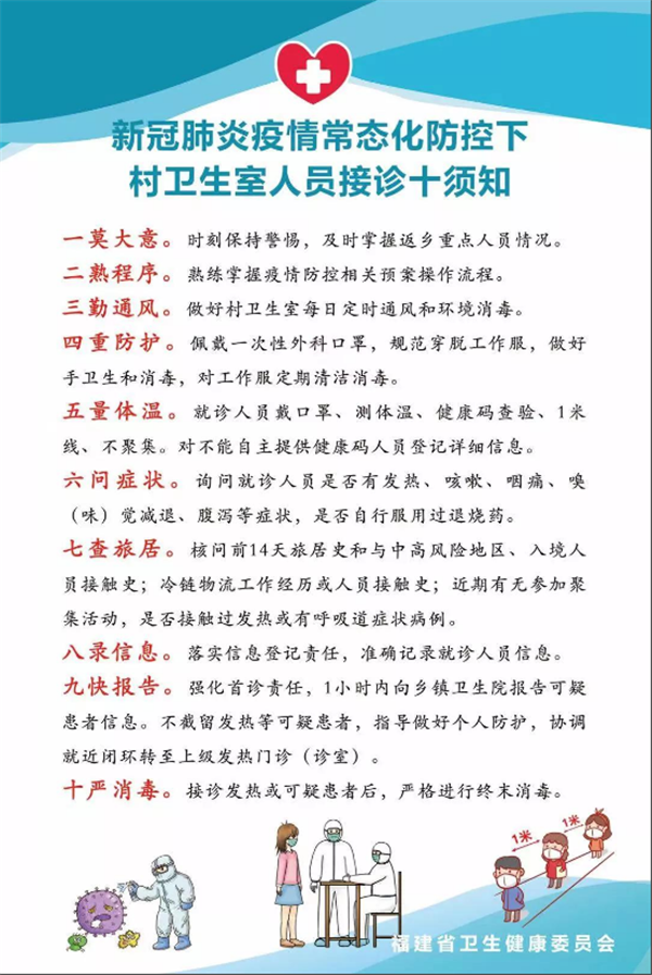 福建日报·新福建客户端1月20日讯(记者 张静雯 储白珊)为进一步加强冬春季农村地区基层医疗卫生机构疫情防控工作,省卫健委日前印发《新冠肺炎疫情防控期间基层医疗卫生机构接诊患者指引》,要求各地督促基层医疗卫生机构和村卫生所、社区卫生服务站严格遵照执行,指导基层医务人员做好接诊工作。