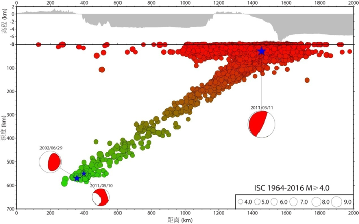 日本海沟至中国东北的剖面两侧300 km范围内的地震深度分布蓝图
