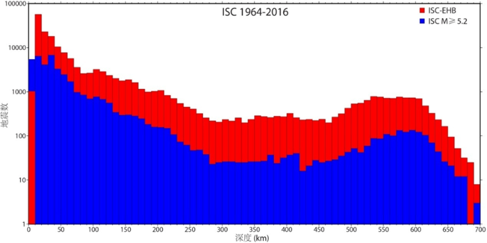 据国际地震中心1964-2016年地震目录统计的地震深度个数分布蓝图