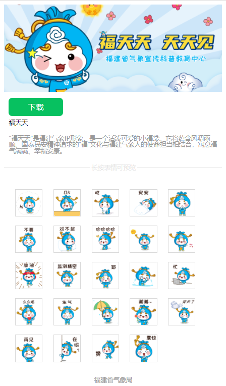 近日,蕴含“福”文化的福建气象IP形象“福天天”表情包在微信表情开放平台正式上架并投入使用。经过几天使用,传播效果良好,获得公众普遍好评和喜爱。
