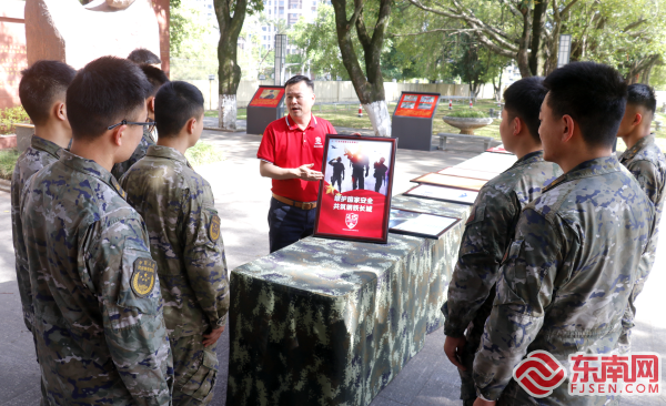 在武警某部雷锋精神主题广场,莆田市全民国防教育讲师团成员、莆田市践行社会主义核心价值观最美退役军人提名获得者、莆田皮雕非遗传承人陈志鸿,为官兵深入讲解皮雕皮画里忠诚守卫祖国海疆、蓝天、边防的故事。