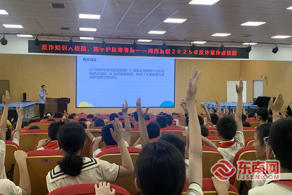 在闽西监狱民警进校园开展法治宣传教育活动中,孩子们踊跃参与其中,积极和民警互动 在龙岩二中,退役军人、闽西监狱六分监狱民警陈玉文以“铸强国魂,立报国志”为主题,为千余名师生作国防教育宣讲。他从《中华人民共和国国防法》切入,系统介绍中国武装力量结构和各军种职能,更以亲身经历的军旅生活,拉近青少年与大国国防的距离。他从“海上守护战机起降”到“高墙内守护社会底线”的岗位转变,生动诠释了军人与警察两重使命背后的同一份忠诚。 在松涛小学,闽西监狱四分监区民警以“平安进校园,安全我护航”为主题,为四年级学生带来一堂实用的法治安全课。围绕交通安全、用火用电、食品安全等内容,民警通过交通标志竞猜、视频案例剖析等形式,增强学生自我保护意识。结合未成年人保护相关法律,他们还将“游戏皮肤诈骗”“追星打赏骗局”等热点问题转化为通俗易懂的案例,引导学生知法守法、远离陷阱。