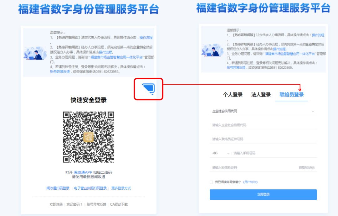 第三步:进入“福建省数字身份管理服务平台”登录页面,可选择联络员扫码登录、电子营业执照扫码登录、CA登录等方式,或点击二维码右上方的小电脑图标,切换至联络员信息登录,在“企业社会信用代码”栏内填写统一社会信用代码,在“联络员证件号码”栏内输入联络员身份证号码,在“手机号码”栏内输入联络员手机号码,然后点击“获取验证码”,收到验证码后输入,点击“立即登录”。